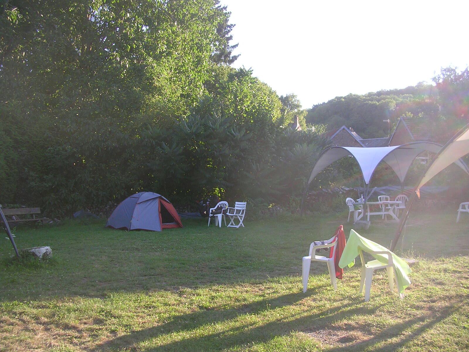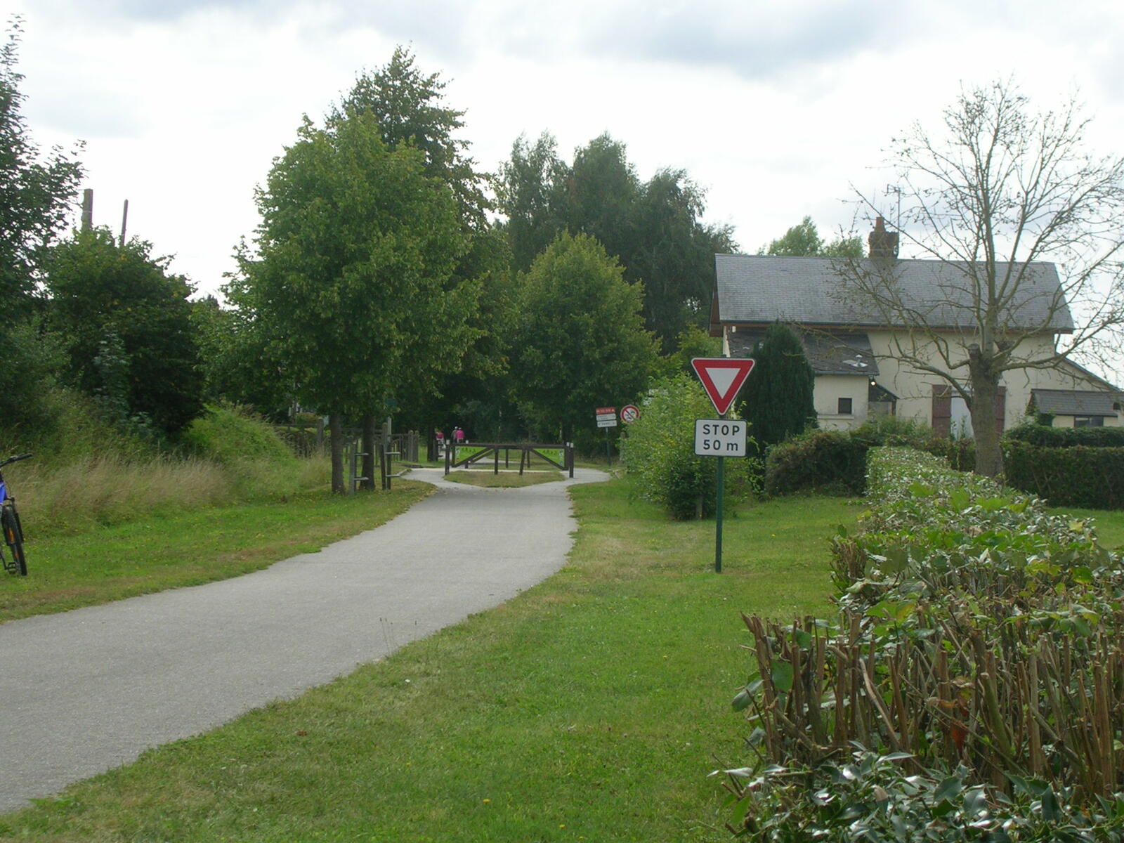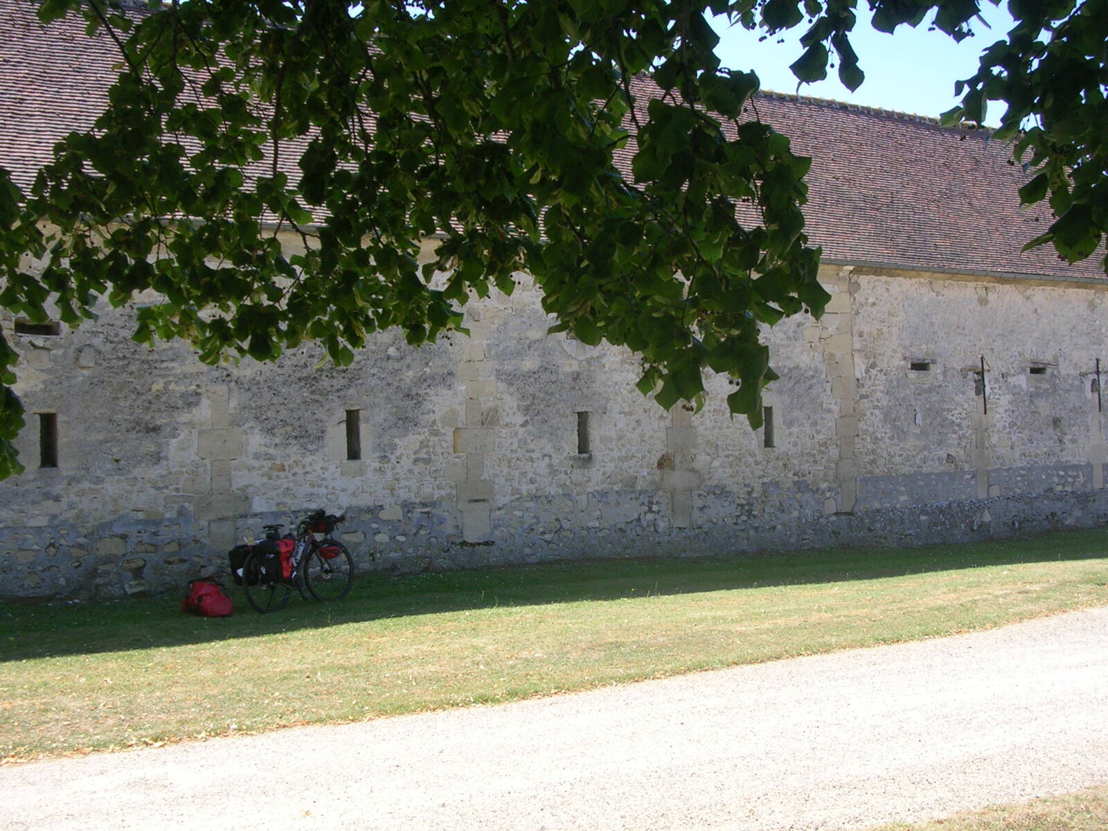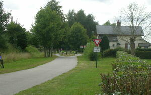 Je passe par le centre-ville pour effectuer le pointage de mes brevets et regagne "l’Avenue Verte Londres Paris", cette ancienne voie de chemin de fer transformée en piste cyclable début 2003. J’en profite pour repérer d’éventuels points de bivouac. Deux bivouacs possibles, à Mesnière-en-Bray à proximité du château de Mesnières et à Neuville-Ferrières laquelle dispose d’un sanitaire, d’un point d’eau et de tables abritées. Une Office de tourisme saisonnière est installée sur le bord de l’AVLP, en face un point de restauration où je mangerai. J’y fais la connaissance de celui que j’ai baptisé le glaneur de l’AVLP. Cethomme du même âge que moi, parcourt la piste avec son VTT pour aller glaner des noisettes ou des mûres et des champignons dans une forêt proche. Il m’offre un café et me raconte sa vie. Après le repas je le retrouverai un peu plus loin sur la piste. A Bellière, je reconnais l’église à proximité du passage à niveau vue lors d’un précédent voyage. A l’approche de Bresles je croise un cycliste que je salue et que je retrouverai au camping peu de temps après. Nos tentes sont proches et nous mangerons sur la même table en échangeant sur le voyage à vélo, l’équipement. A côté de nous une famille de cinq avec de jeunes enfants qui viennent d’Allemagne et va rester deux jours pour prendre le temps de sécher le linge. Comme dans la chanson de Maxime le Forestier, un autre arrivera plus tard, il repart dans son pays, la Pologne. L’anglais reste le moyen le plus facile pour échanger avec ces voyageurs au long cours.