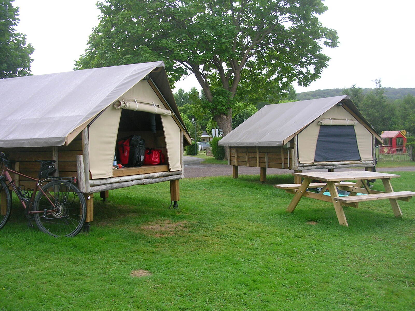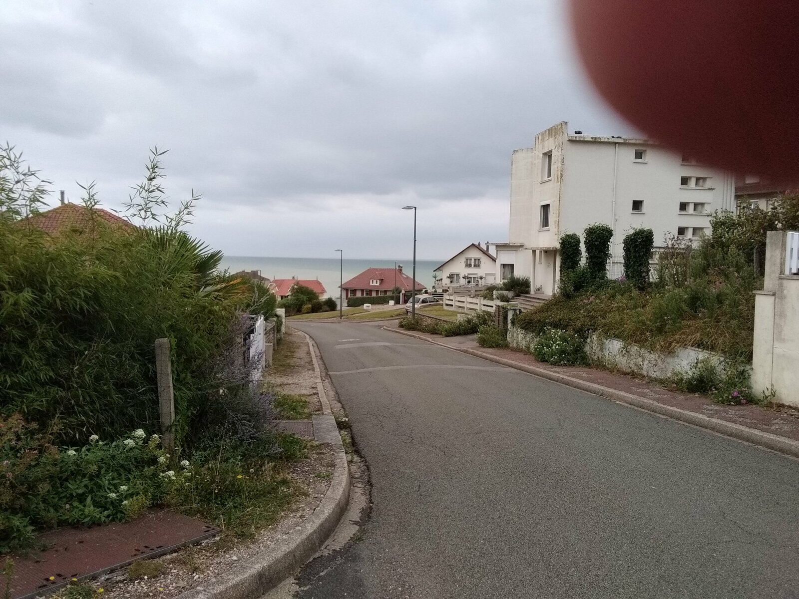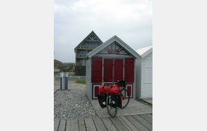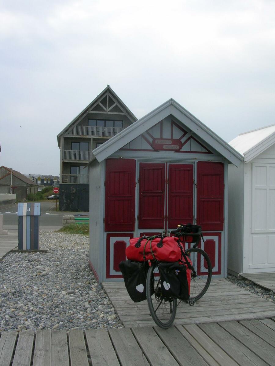 Par chance, il n’a pas plu cette nuit, mais le vent a soufflé fort. Un début de parcours en douceur, mais déjà la première grosse montée se présente, pour accéder au plateau, emprunter un chemin agricole, c’est du gravel involontaire. Avec le vent dans le dos, de bonnes longues descentes, j’arrive relativement vite à Noyelles-sur-mer. Je me retrouve en terrain connu pour l’avoir déjà parcouru avec mon épouse. J’atteins facilement Saint-Valéry-sur-Somme avec toujours un vent de dos qui me pousse rapidement. Arrivé vers 13:30h à Cayeux-sur-mer, je fais une pause pique-nique sur un banc face à la mer, le dos aux cabanes qui bordent le chemin de planches permettant de marcher sur les galets. Au Tréport pour passer du port à la ville haute, j’emprunte le funiculaire et dans la cabine, j’écoute ce petit garçon qui me parle de son expérience de jeune cycliste. Ses yeux brillent, arrivé en haut, il monte sur le porte-bagages du vélo de son grand-père et me fait au revoir de sa main. Je suis la Vélo-maritime "EV4", à la sortie de Criel-sur-mer, je rattrape un jeune couple qui cherche son chemin sur son smartphone. Je les accompagne un brin de route. Ils viennent de Lille, Simon et sa copine (comme il me l’a présentée) a 29 ans, et voyagent pour la première fois sur des vélos simples avec des sacoches Décathlon jaunes neuves. Simon me dit avoir un petit budget et que ce voyage jusque Fécamp est pour eux le moyen le plus économique pour beaucoup de liberté. Nous nous séparons en route, mais je les retrouverai à mon arrivée, au camping d’Arques-la-Bataille. Demain, ils prendront sûrement la "route du lin" pour rejoindre Fécamp et rentrer à Lille par le train. Quelques gouttes de pluie m’incitent à louer un "Campana" une sorte de tente sur pilotis. J’ai bien fait, une petite pluie aura mouillé l’herbe dans la nuit et je n’aurai pas de tente à faire sécher et plier au matin.