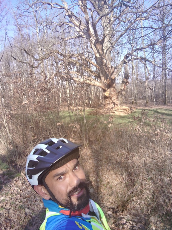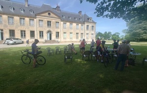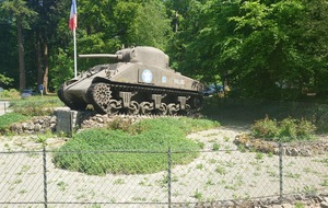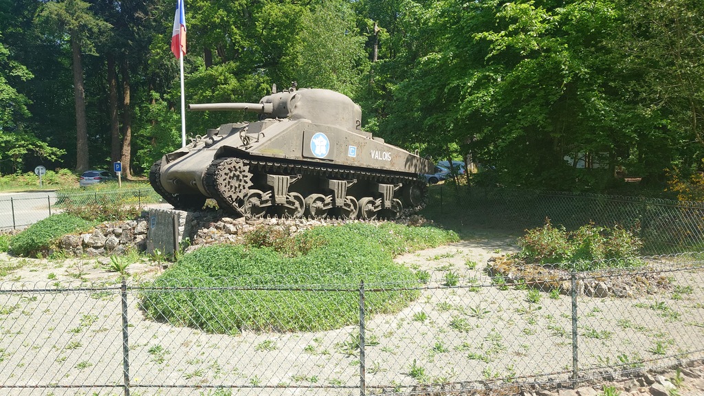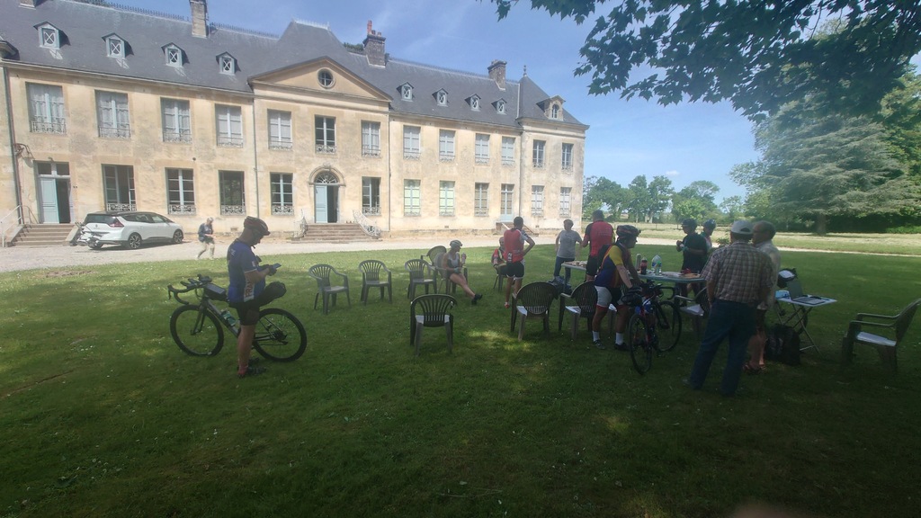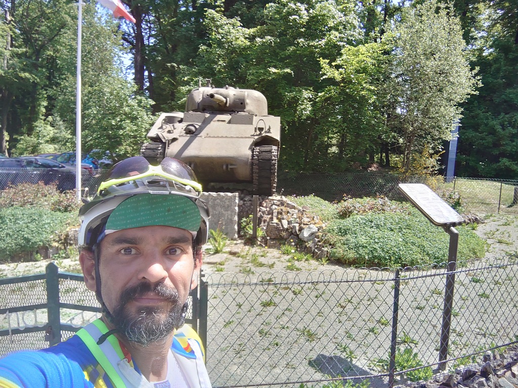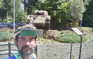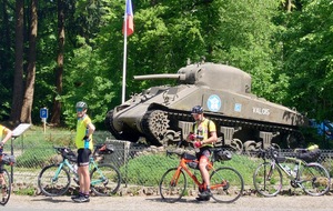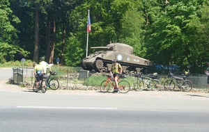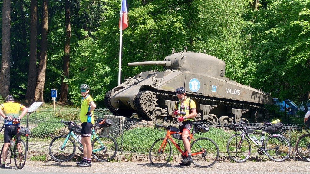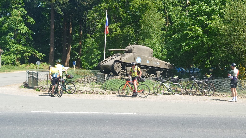 J'ai fait de belles rencontres comme par exemple ce cyclo avec sa randonneuse victoire d'un bleu azur magnifique. Certains participants avaient déjà réalisé le PBP et échangé avec eux a été intéressant. Malgré les arrêts un peu désordonnés lors du premier CP, nous avions tous pu nous rattraper et poursuivre le parcours. A 13h, nous voici dans la fa forêt d'Ecouves à grimper la côte où trône le char Valois.