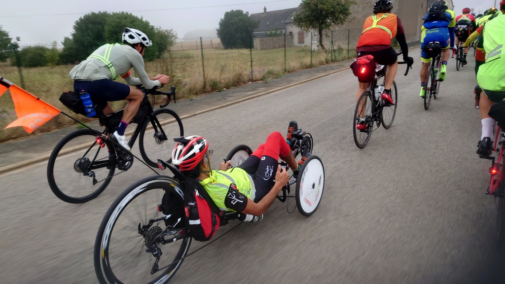 Le départ fut donné sur les chapeaux de roues. Alors que le peloton tutoyait les 30~32 km, déjà un petit groupe s'était mis en tête d'avaler les 650km en moins de 24h. Ce petit groupe nous a distancer au fur et à mesure pour terminer finalement en 25h environ. Ils ont aussi subi un abandon dans leur groupe, suite à l'effort intense que cela nécessitait. J'ai été impressionné par un participant en vélo couché. Il était scotché au bitume et dans les virages, on aurait cru voir un kart ou une formule un tellement ses trajectoires étaient propres et sans perte de vitesse. Le peloton s'est éclaté au niveau de Chambord. Les premiers caracolaient déjà avec 20 minutes d'avance. J'étais dans un petit groupe tournant à 30km/h mais je savais compte tenu de ma monture que je ne tiendrais pas avec eux. Avec mon paquetage, le poids de l'ensemble vélo/équipement avoisinait les 19kg alors que mes compagnons s'étaient répartis les outils et avaient que nourriture et un sac de survie. Je les ai perdu à Blois puisque je me suis arrêté prendre à manger. J'ai poursuivi la suite du périple avec Benjamin que je n'ai plus lâché jusqu'à l'arrivée.