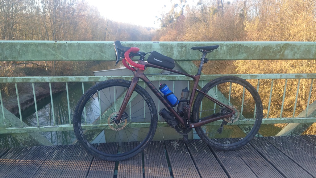 Vient ensuite un drôle d'équipier, habillé de bleu, un vélo quelques crasseux et un cintre tout ce qui a de plus normal sur la route mais moins pour une randonnée VTT : c'est Christophe Uno sur son gravel.