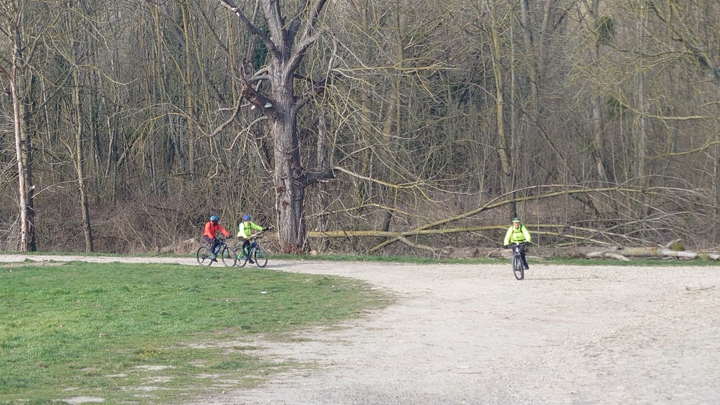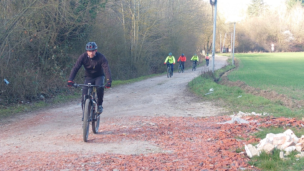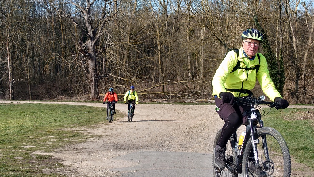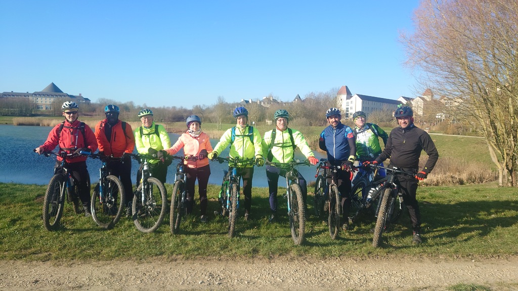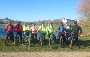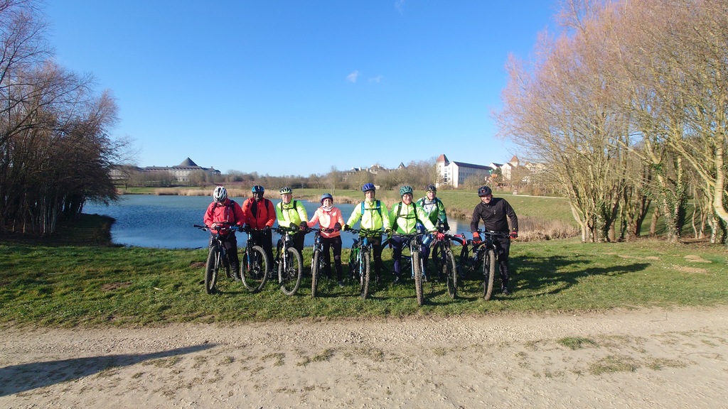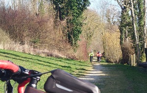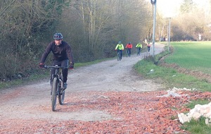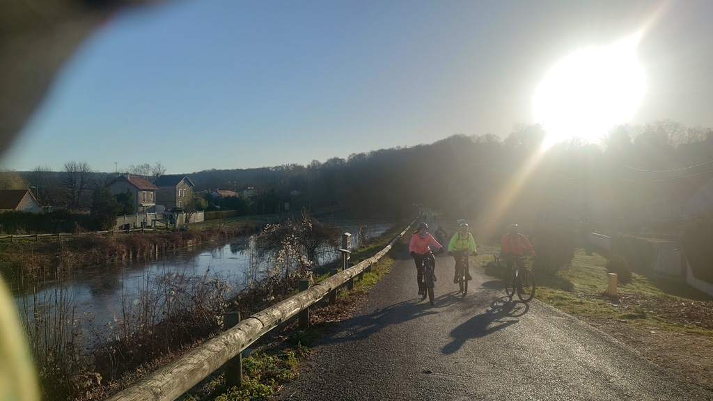 La direction est donnée et cap vers Val d'Europe. Petite montée en direction de Mareuil-les-Meaux avant de rejoindre les berges du canal de Chalifert. L'ambiance est bonne enfant, ce n'est que l'échauffement après tout. S'échauffer c'est ce qu'à dû faire Christophe Dos qui venait à notre rencontre à Condé. Il fut agréablement surpris de la petite huitaine de vététistes (et graveleux) arrivant à sa rencontre .