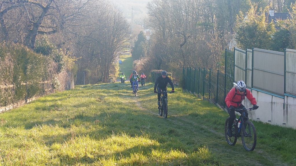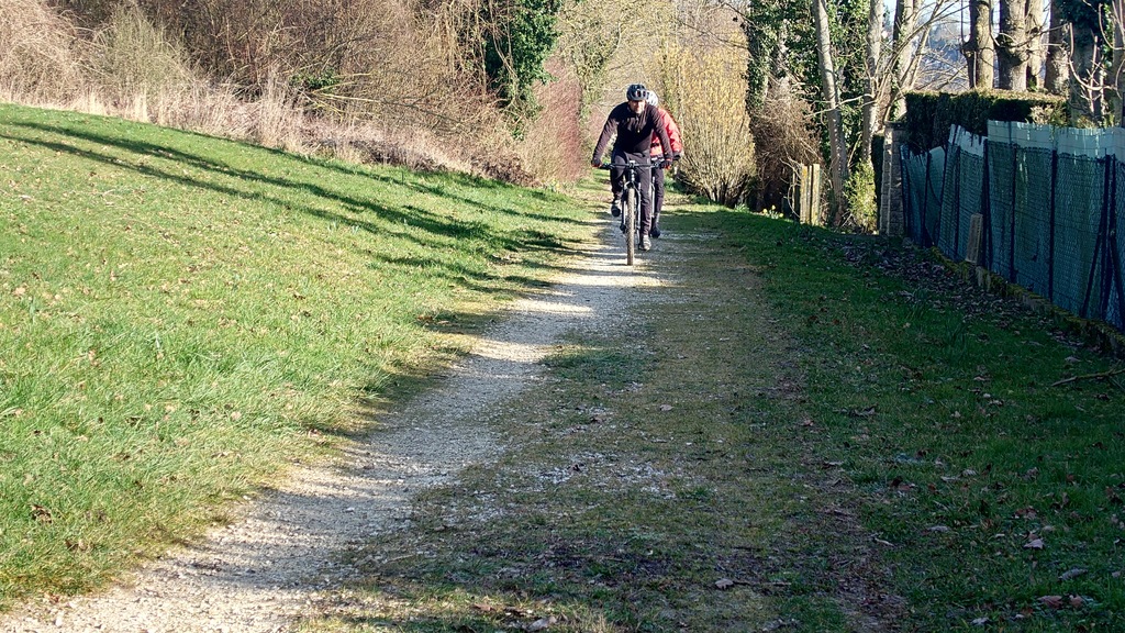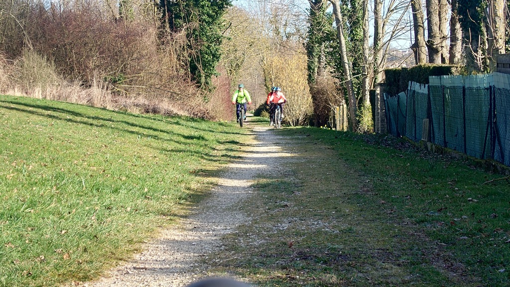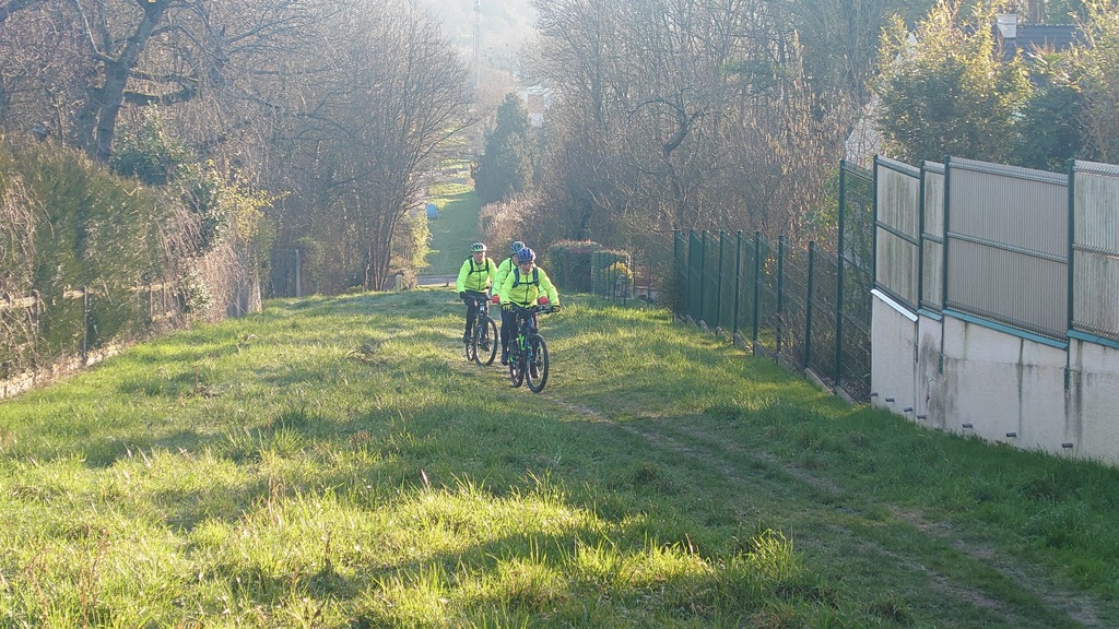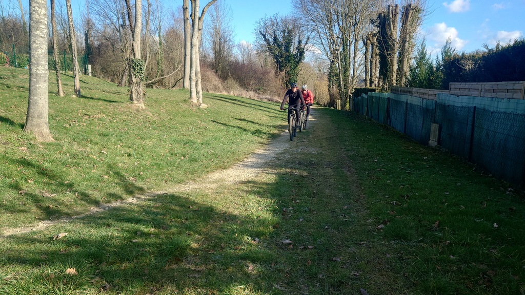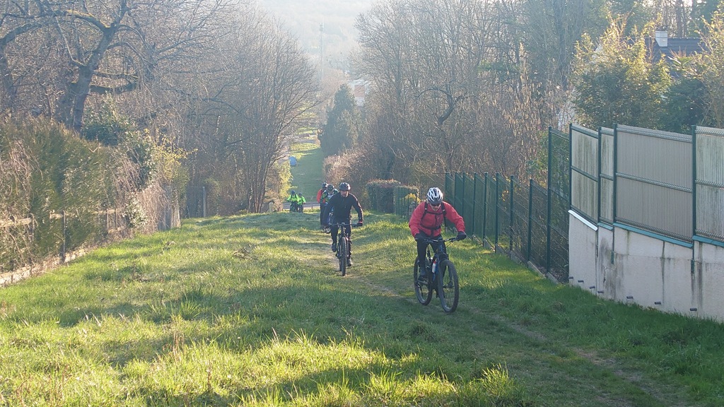 Petit passage sur la route avant de rejoindre la Dhuys et entamer la première vraie montée. Comme à l'accoutumée les fous furieux s'élancent les premiers et le gravel montre qui est le patron, faut dire que tout rigide qu'il est, c'est plus facile de garder du rendement sur l'herbe. D'ailleurs pour la saison, l'herbe est verte et sèche, pas un gramme de boue ne vient entamer la joyeuse cordée qui monte, monte vers les hauts surplombant Esbly.