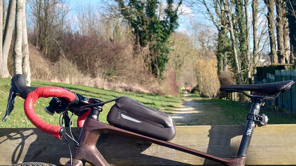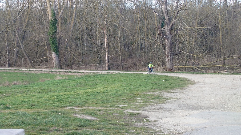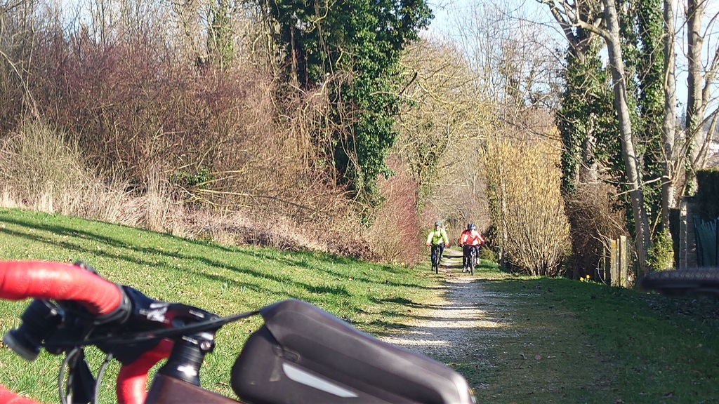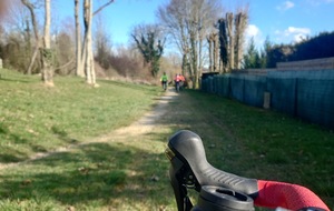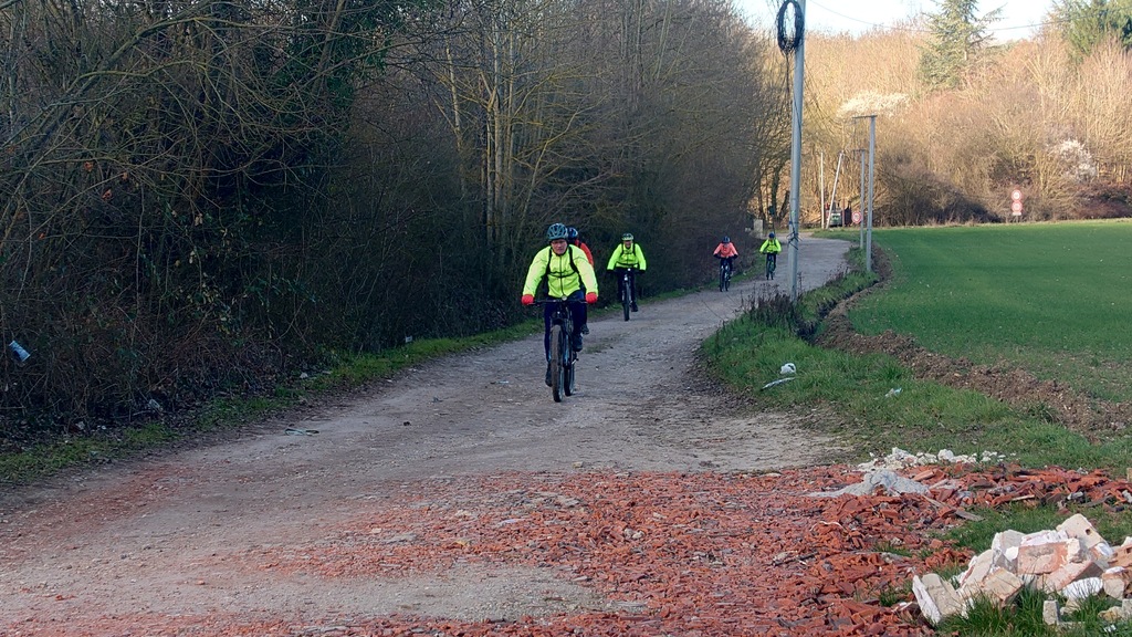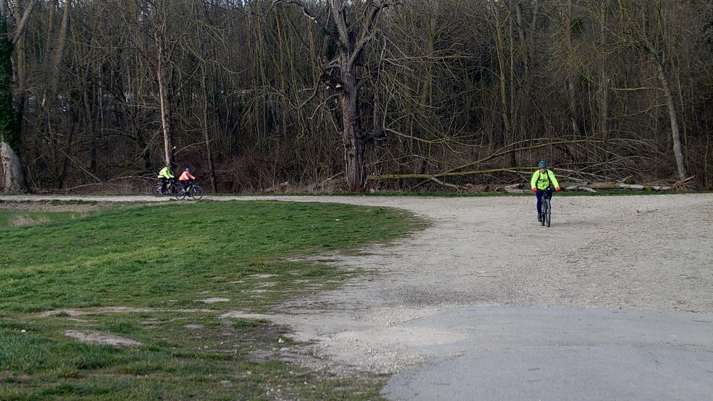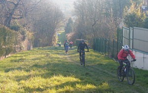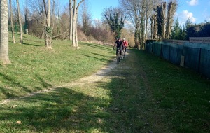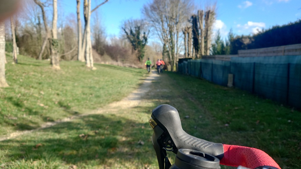 Petit passage sur la route avant de rejoindre la Dhuys et entamer la première vraie montée. Comme à l'accoutumée les fous furieux s'élancent les premiers et le gravel montre qui est le patron, faut dire que tout rigide qu'il est, c'est plus facile de garder du rendement sur l'herbe. D'ailleurs pour la saison, l'herbe est verte et sèche, pas un gramme de boue ne vient entamer la joyeuse cordée qui monte, monte vers les hauts surplombant Esbly.